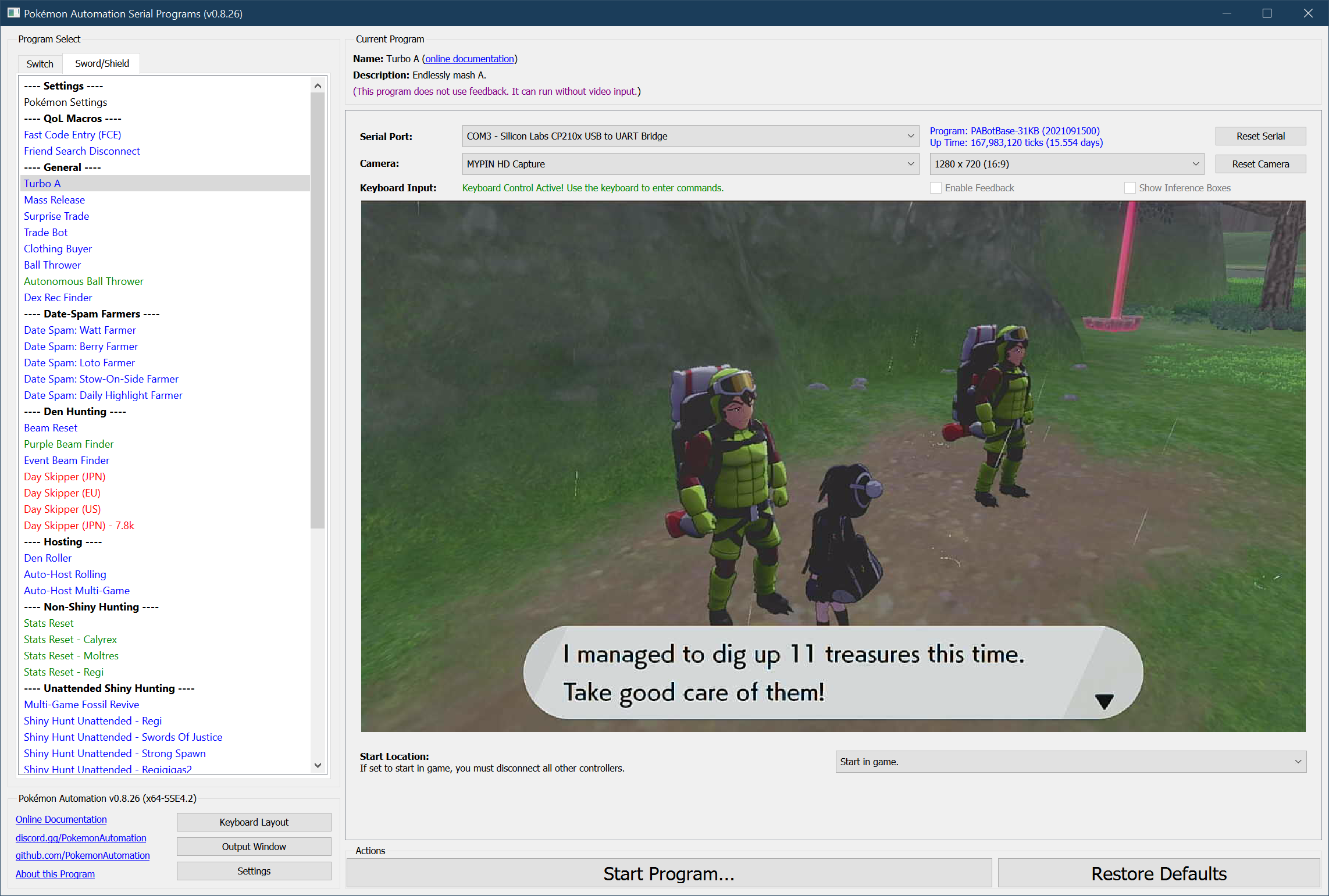 Once the program starts, it will enter the game and start mashing A at approximately 14 times/second. Stand in front of either the Digging Duo. For the Cram-o-matic, make sure you have already selected your ingredients. When running this on the Cram-o-matic, you need to keep an eye to make sure you stop the program when you run out of ingredients. Otherwise, it will keep churning through different items depending on what you have next in your inventory.