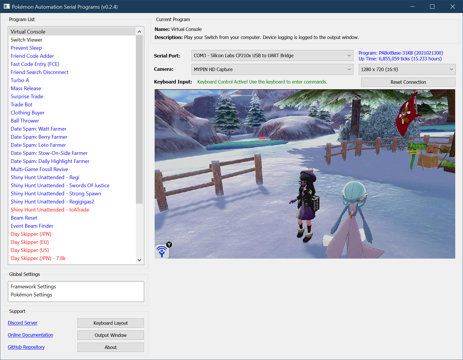 This requires that the program on the device is PABotBase. PABotBase is the only program that will accept keyboard commands.
