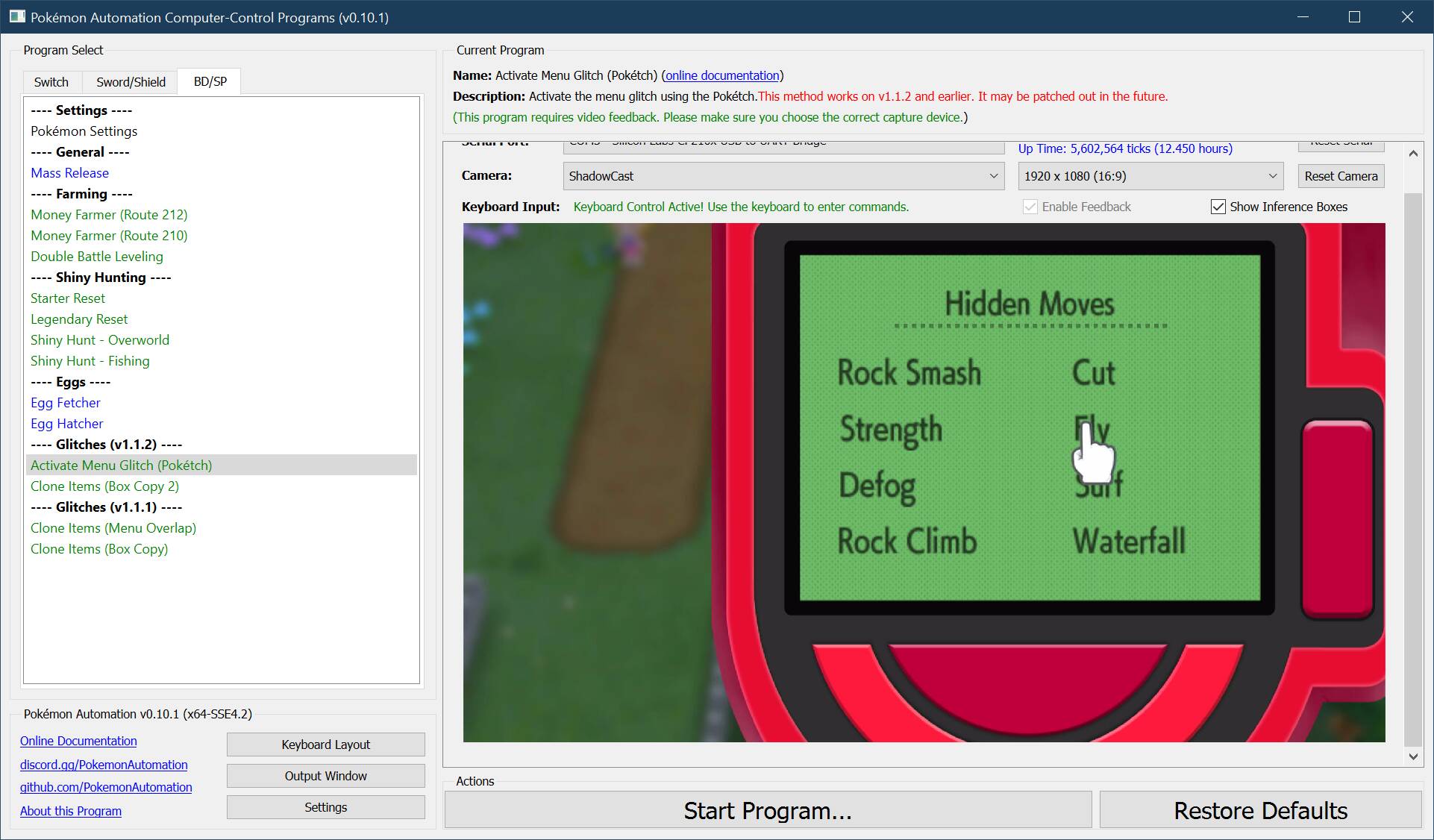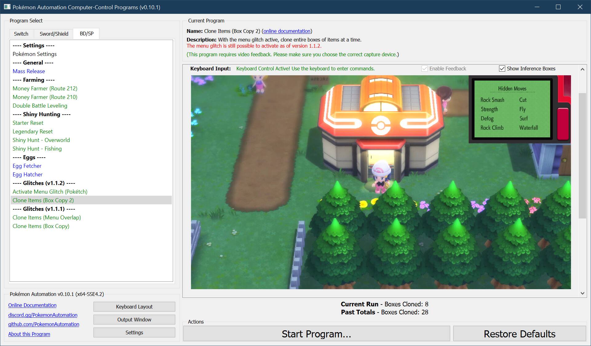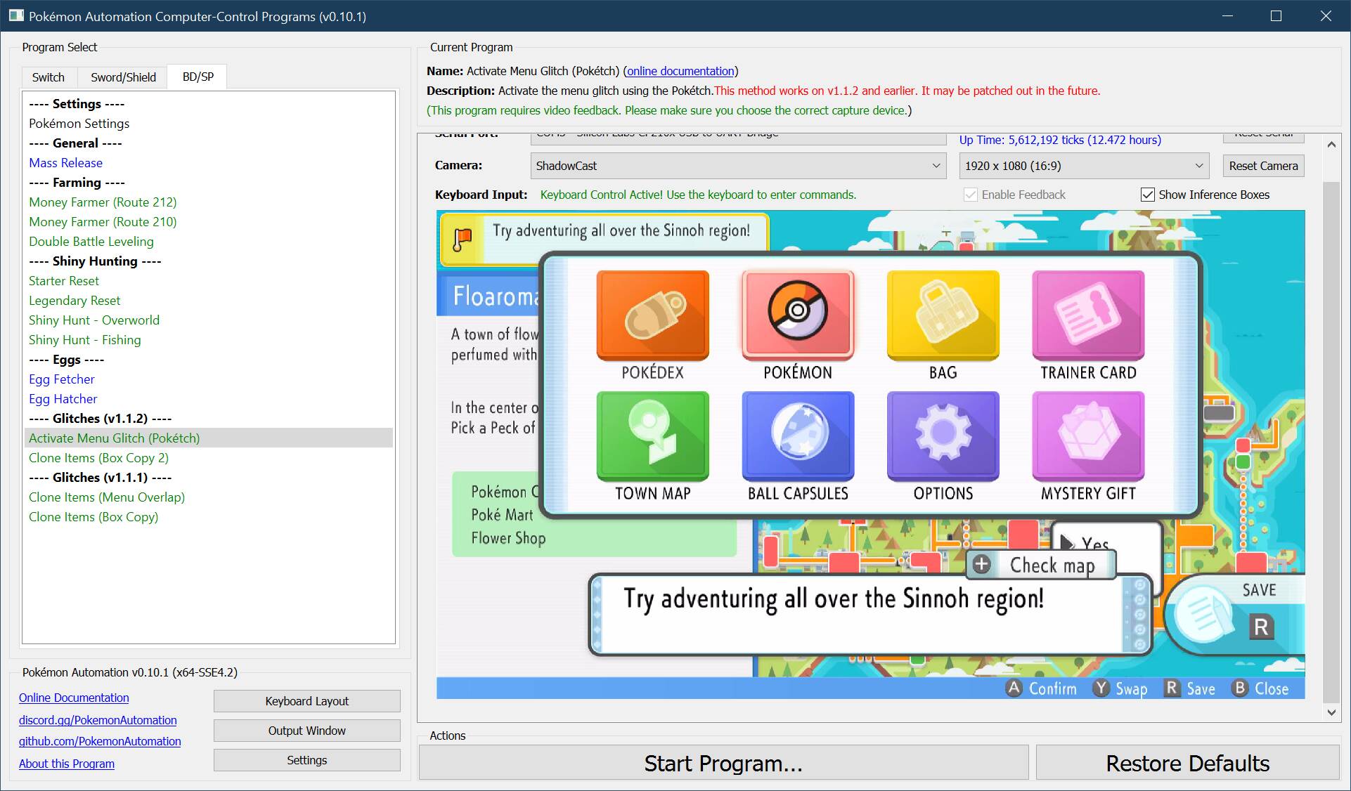 The program will attempt to enable the menu glitch. Then it will enter the Pokémon center and park in the ideal spot to run the cloning programs.