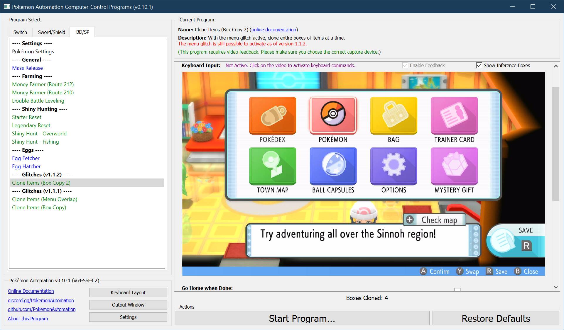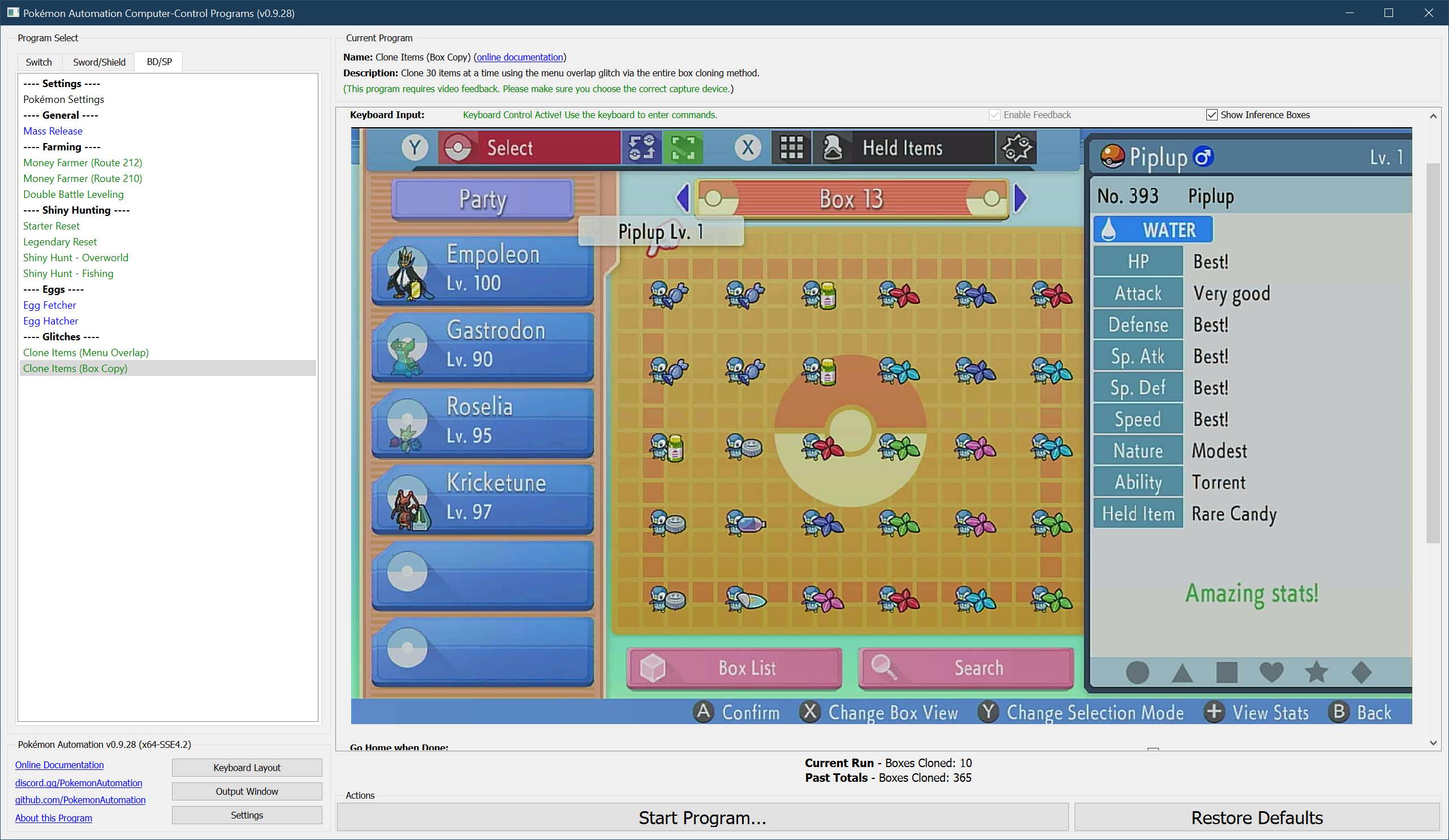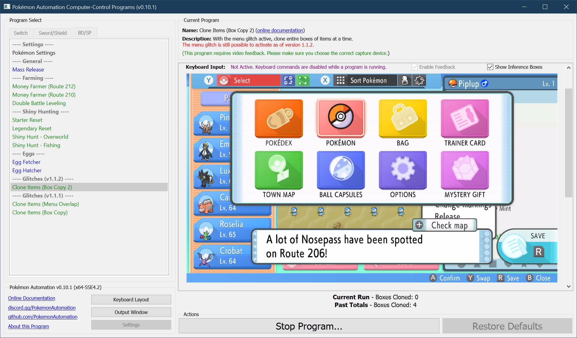 The program will enter the box system, clone the current box, release the clones (which detaches items to your inventory), and repeat. Unlike the previous version of this program, it will not back out into the overworld and reactive the glitch.