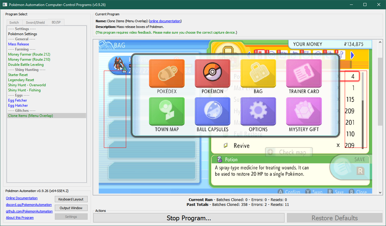 The program will trigger the overlap glitch, then clone the 5 Pokémon in your party, detach their items, and continue.