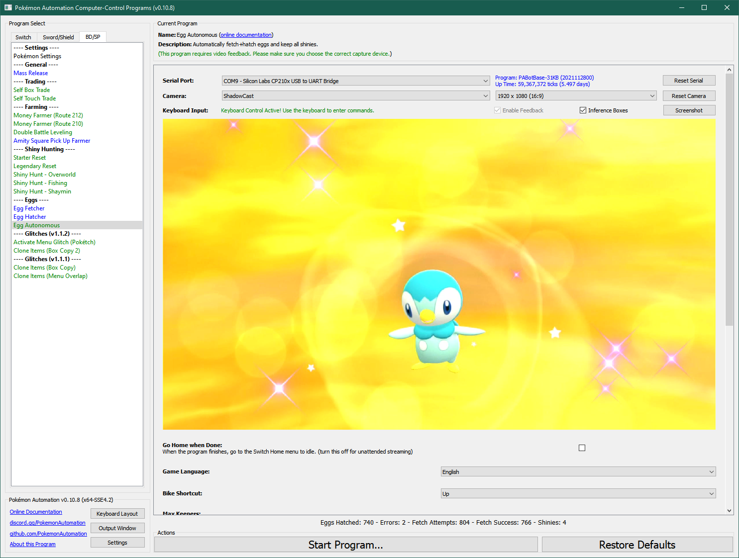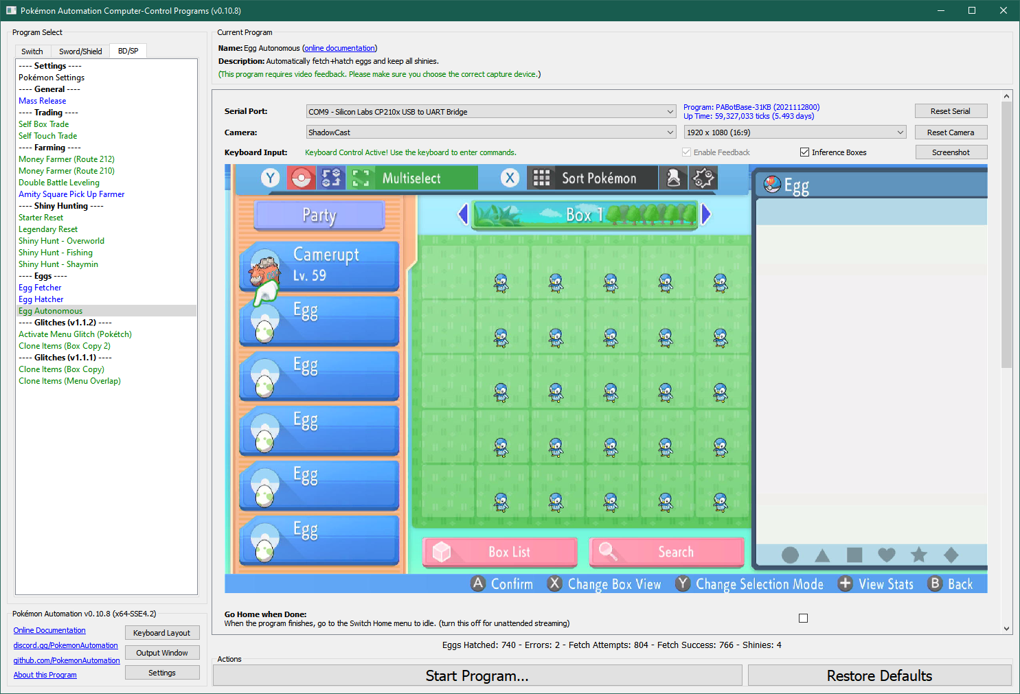 Once the program starts, it will immediately save the game (if Auto-Saving is enabled) and start spinning. It will periodically fetch eggs and hatch your entire party.