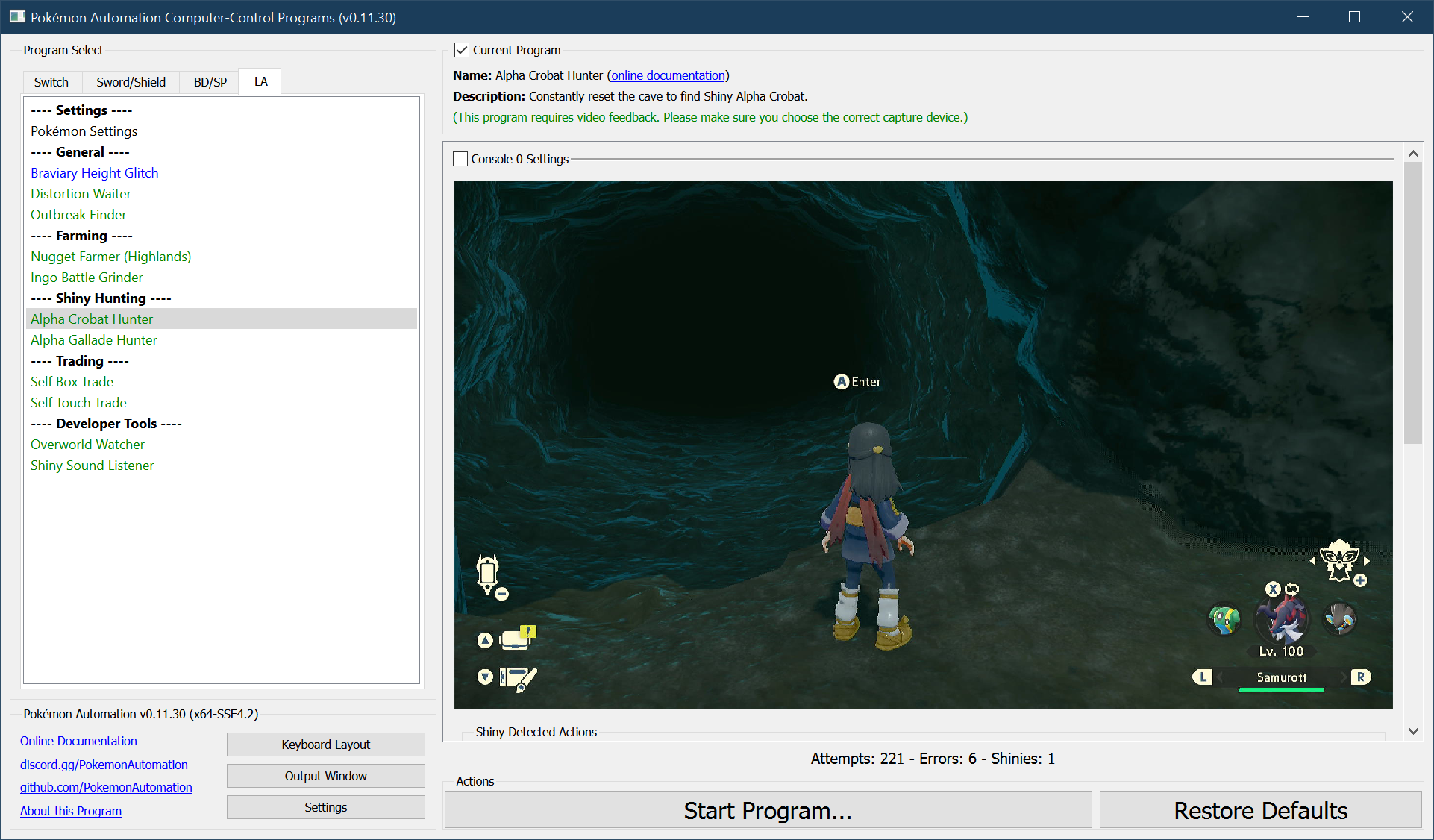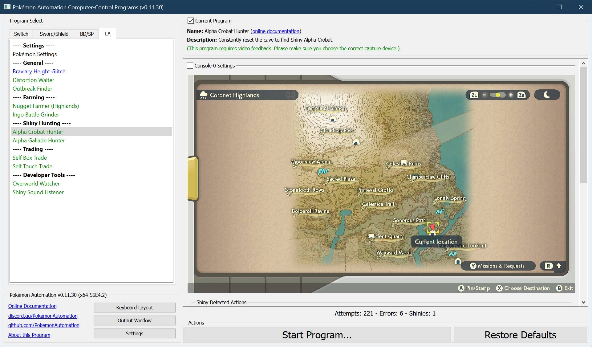 The program will repeatedly enter the cave, navigate to the alpha Crobat, and reset. If the program finds a shiny, it still stop and go to the Switch home to freeze the game.