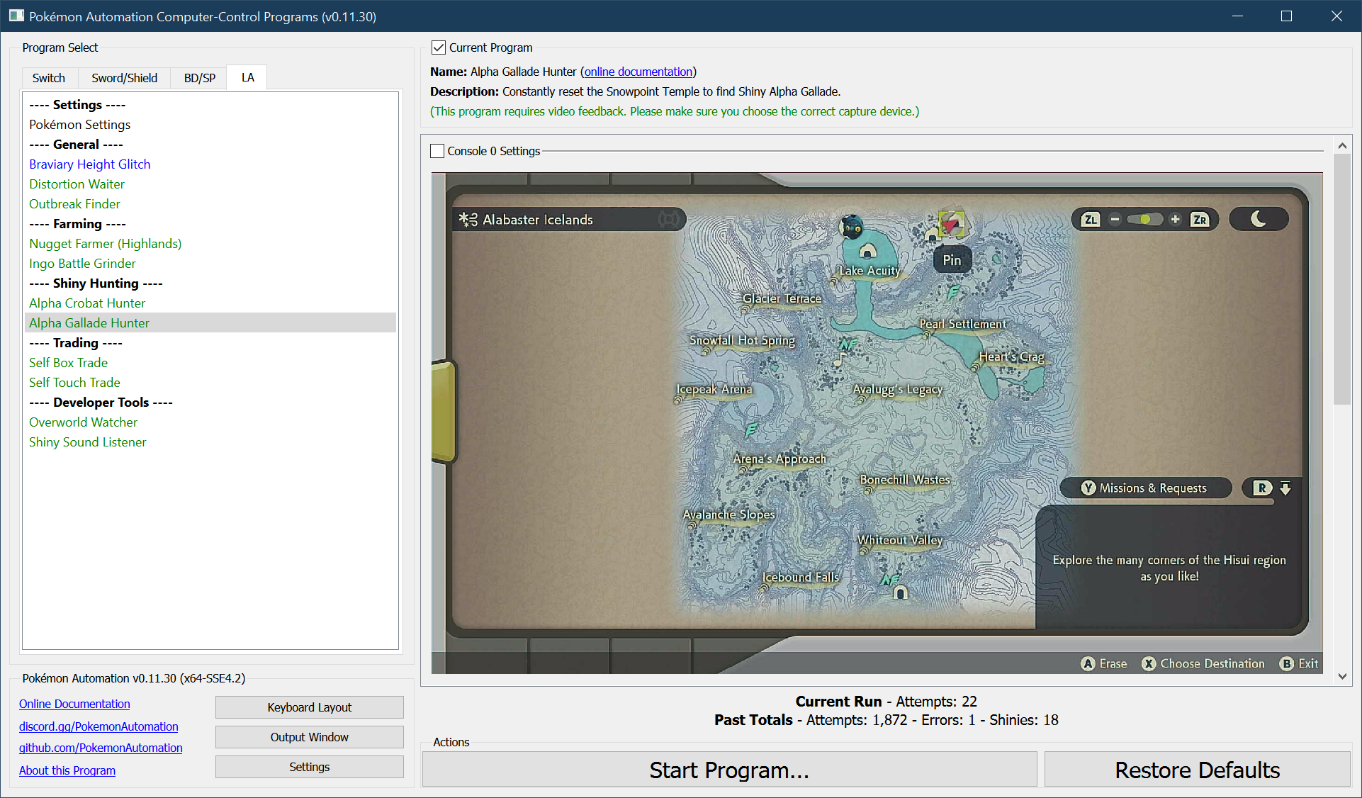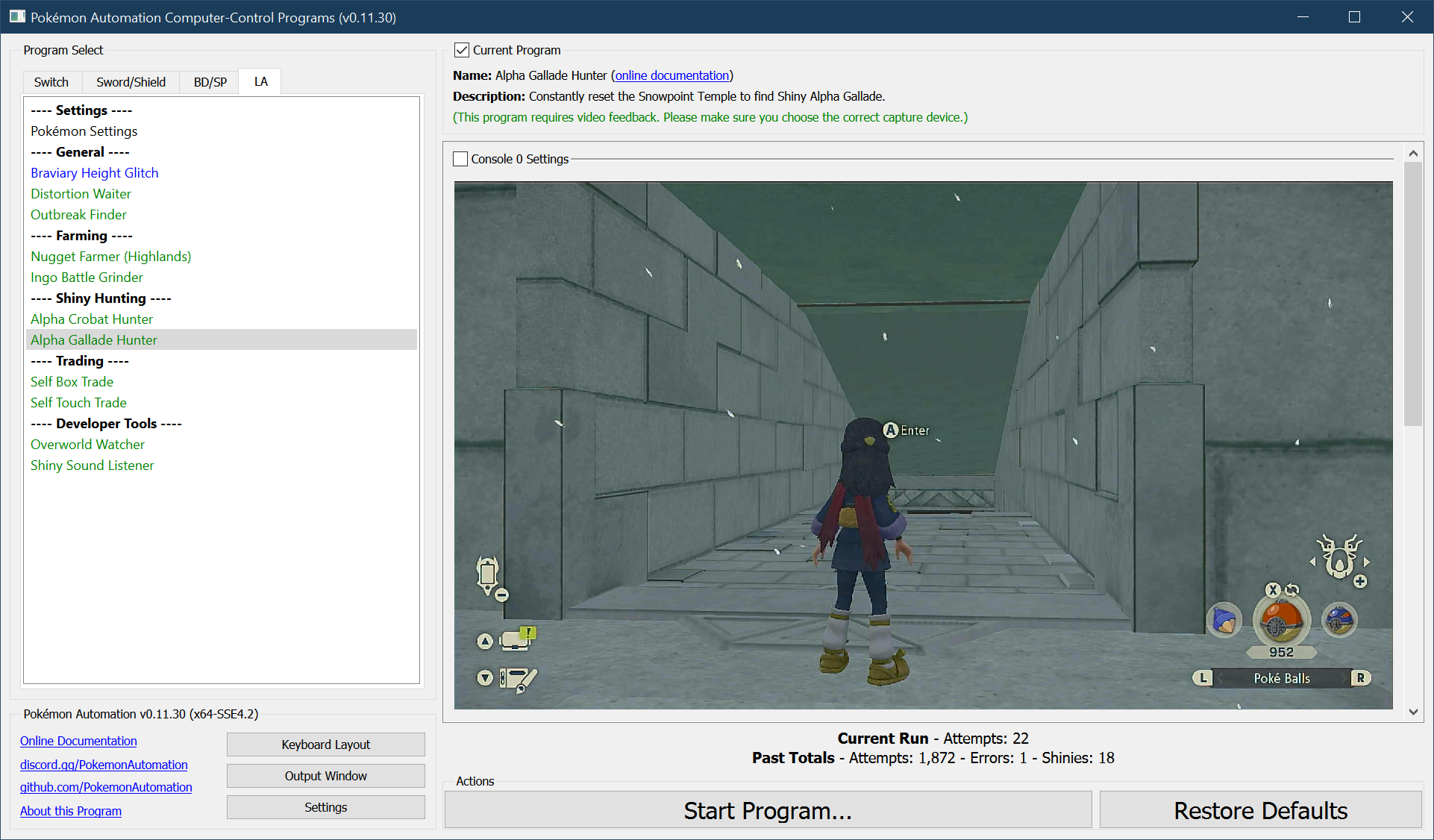The program will repeatedly enter the temple, navigate to the alpha Gallade, and reset. If the program finds a shiny, it will stop and go to the Switch home to freeze the game.