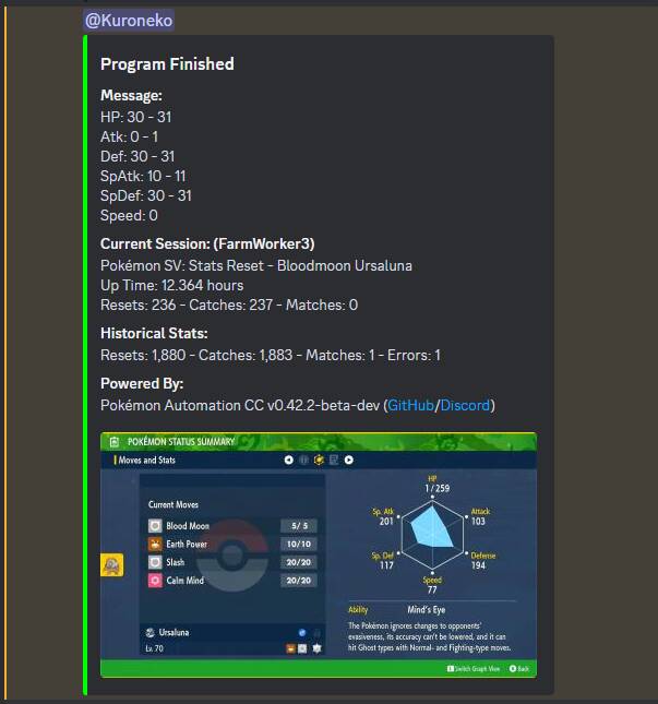 Starting from v0.42, the program will calculate the IV range from Ursaluna's stats instead of finishing the post-catch dialog and navigating to the box system to use the IV judge. This has the following implications: