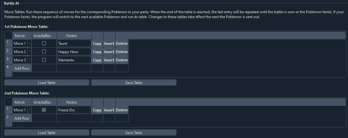 The program will send out the Pokémon in the order they are in your party and use the moves in the selected order. Once the last move is reached, it will be repeated until the battle is won or the Pokémon has fainted. If your Pokémon faints, the program will send out the next Pokémon in your party.