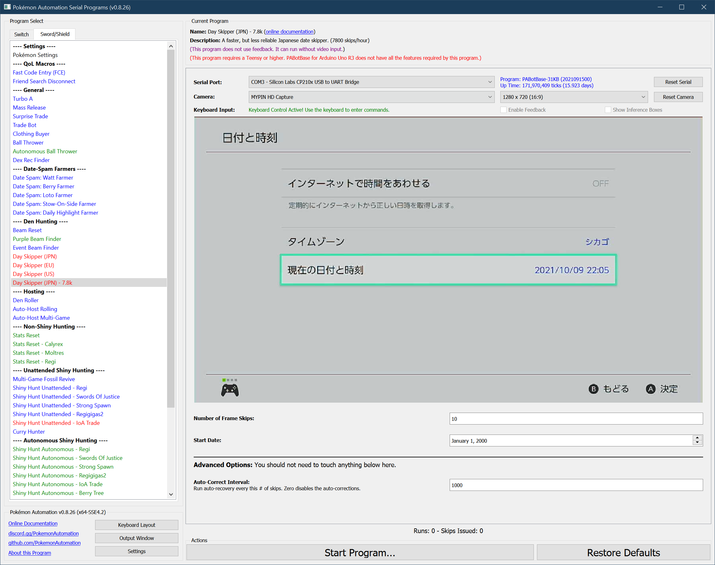 This is a faster JPN day skipper that runs at 7827 skips/hour. This program only runs on the Switch 1 with a wired controller. All other setups are not supported.