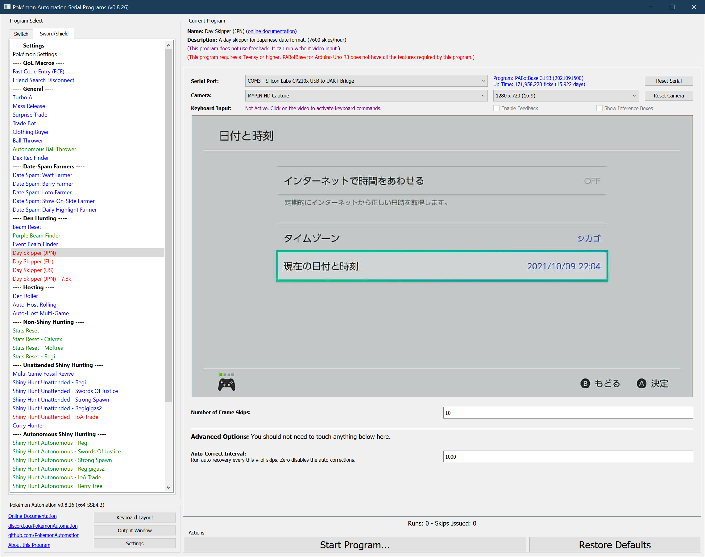 When the program finishes skipping, it will continue to enter/exit the date change menu every 15 seconds without changing the date. This prevents the time from advancing naturally and potentially passing midnight which would result in an extra (unintended) day skip.
