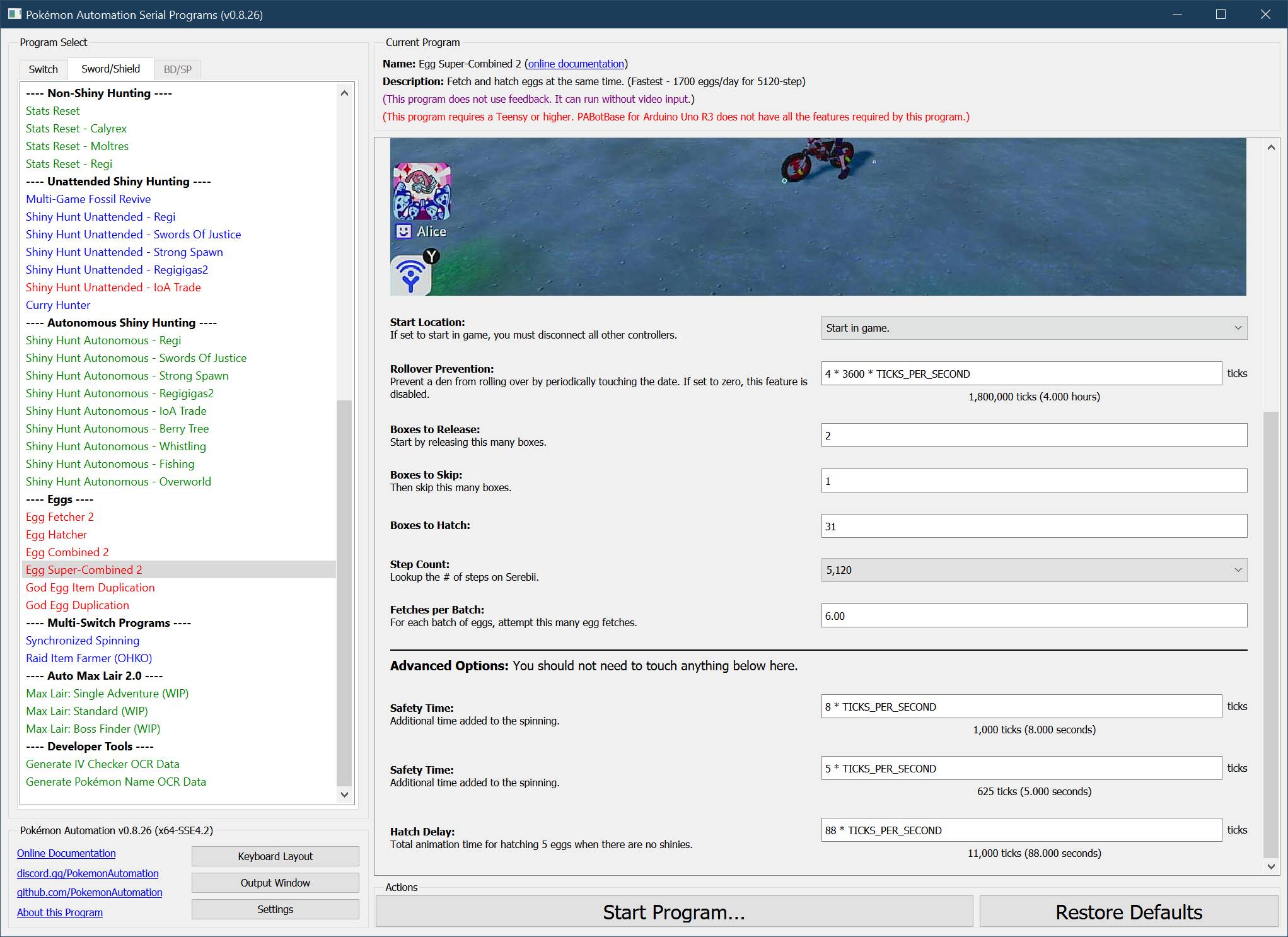 EggSuperCombined2 is the most optimized of the egg programs in this package. When used properly, it can allow 24/7 hatching while requiring the user to only touch the Switch twice a day. Thus this program is most suitable for mass production of hatched shinies - especially multiple Switches where you want to minimize the amount of interaction required for each Switch.