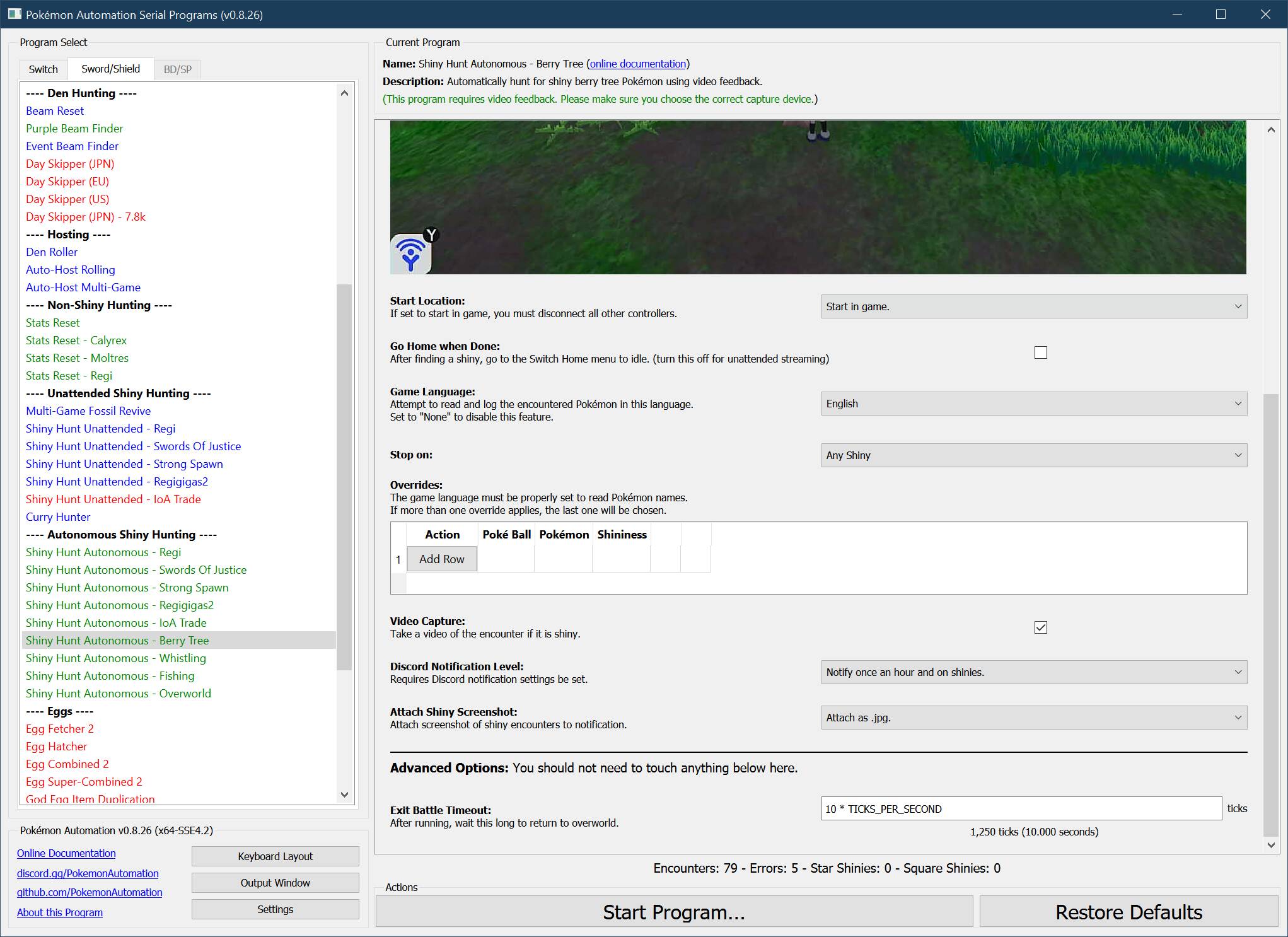 Unlike the Shiny Hunt (Unattended) programs, the Autonomous programs require no calibration. This program needs a capture card to detect a shiny from its animation.