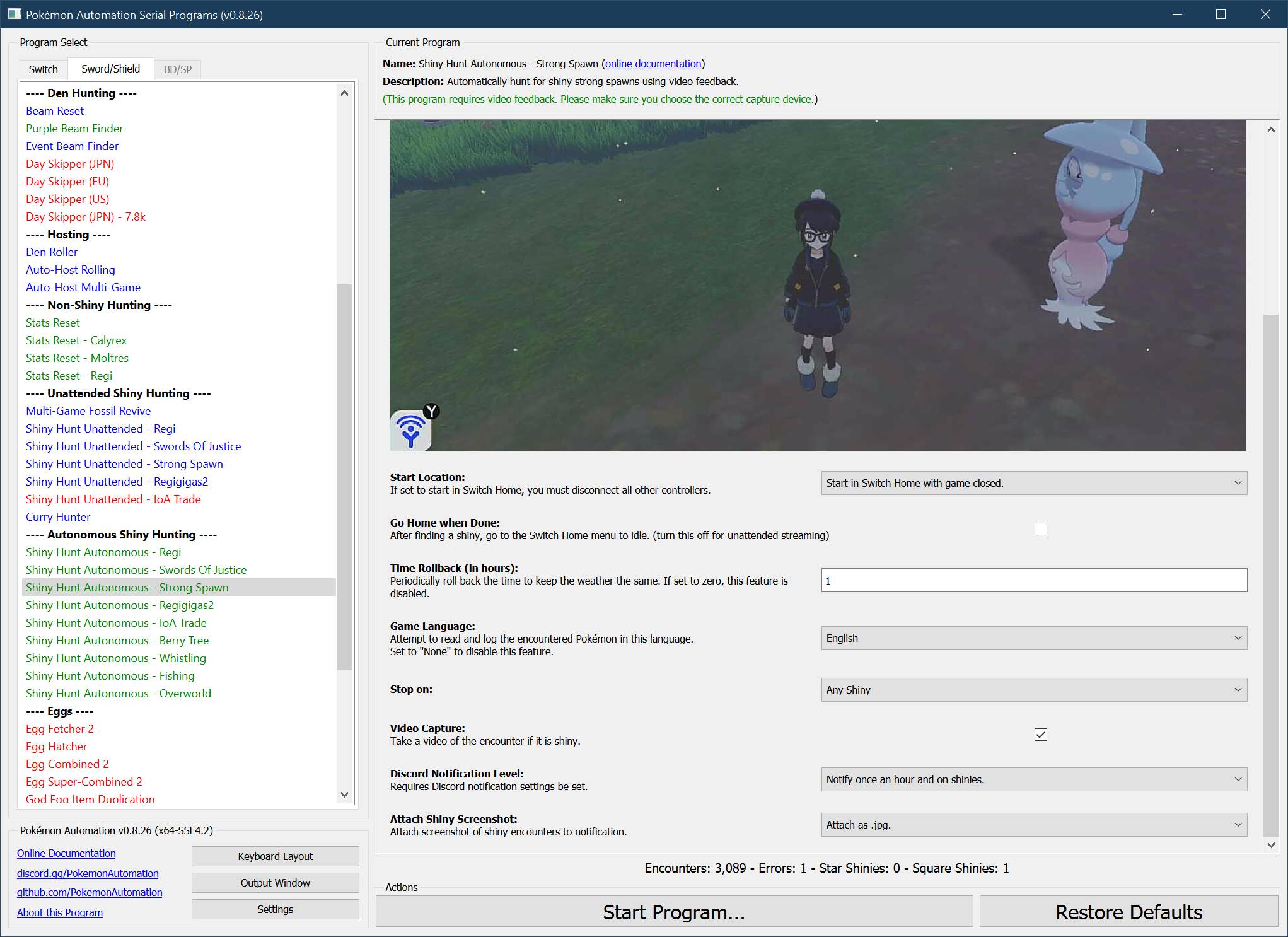 This program will automatically hunt for a shiny strong spawn and automatically stop on a shiny. It fully utilizes video feedback and has these advantages over the unattended version of this program: