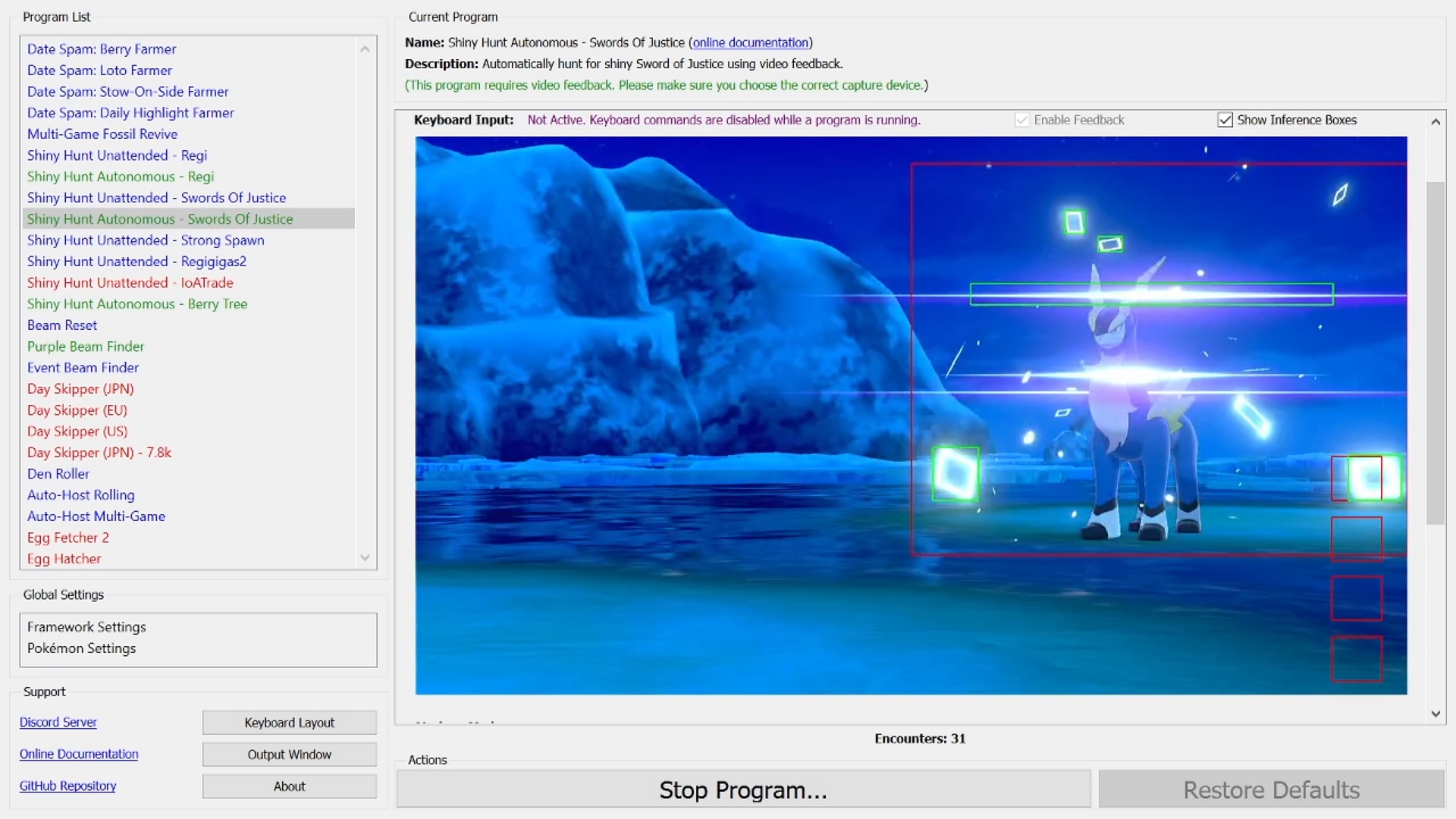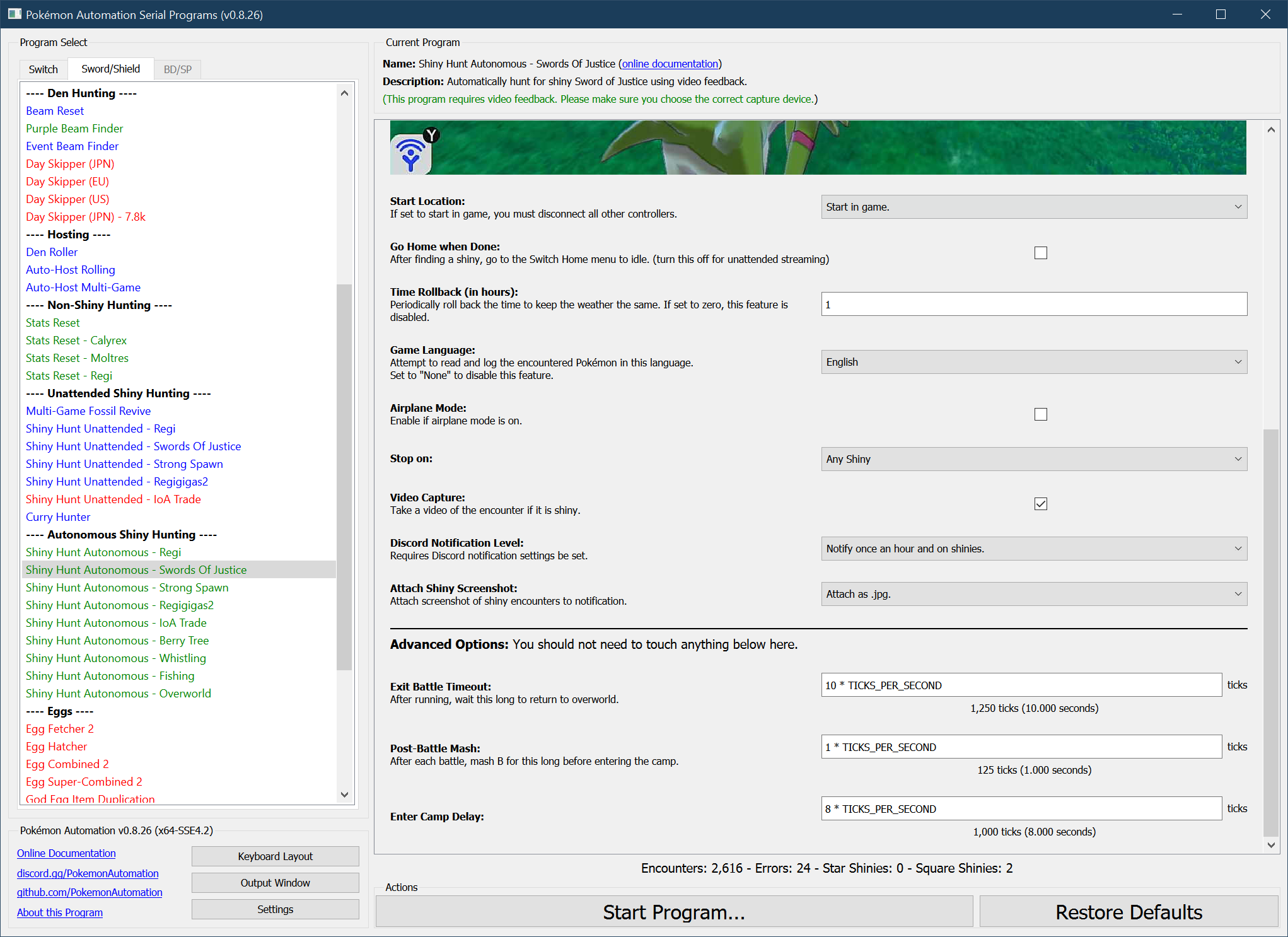 This program will automatically hunt for a shiny Sword of Justice and automatically stop on a shiny. It fully utilizes video feedback and has these advantages over the unattended version of this program: