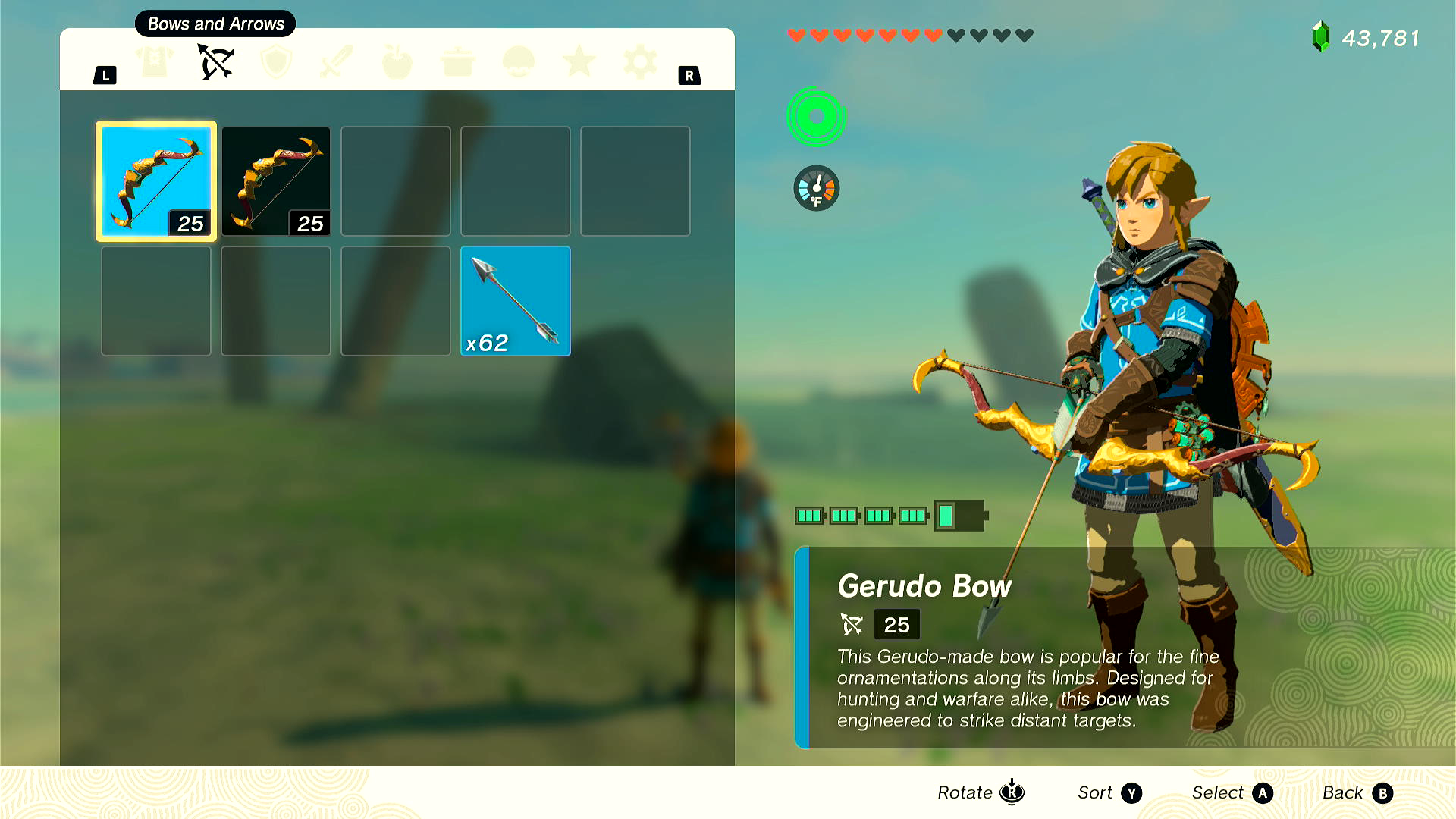 - Enter the menu, navigate to the Bow listing, make sure your equipped bow is in the first slot (swap bows if necessary), put the cursor over the equipped bow, and exit the menu.