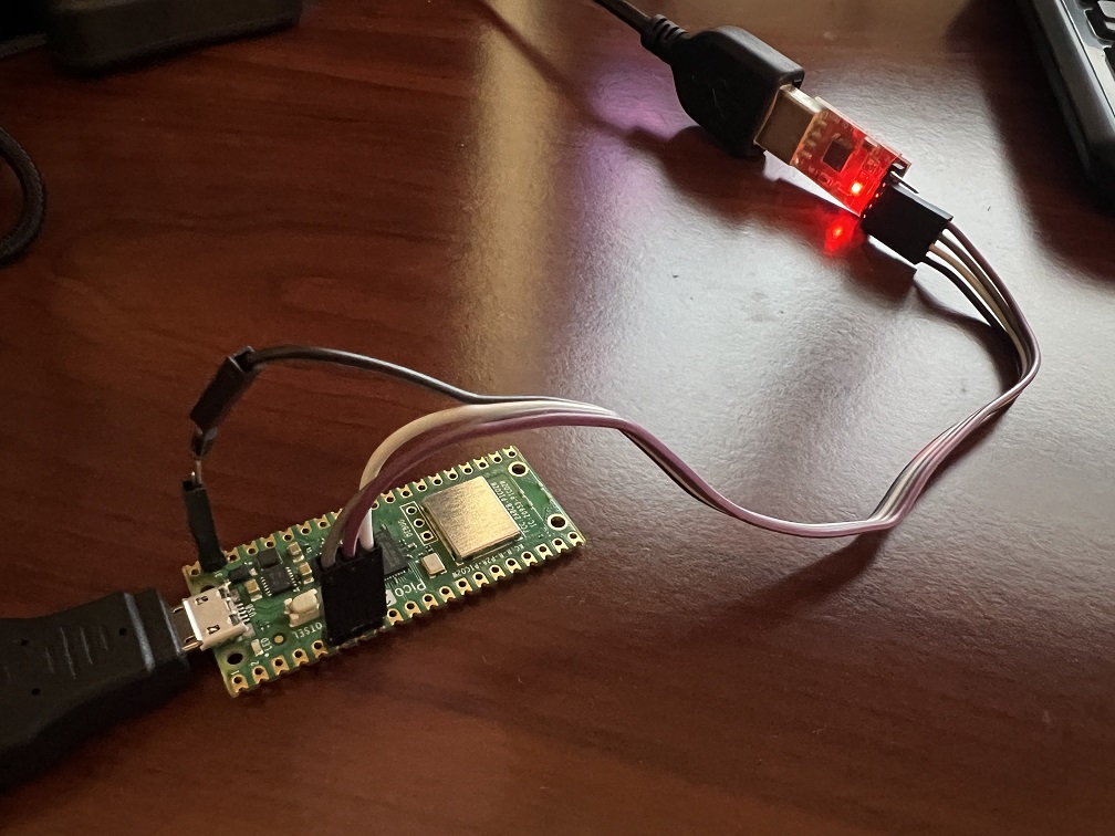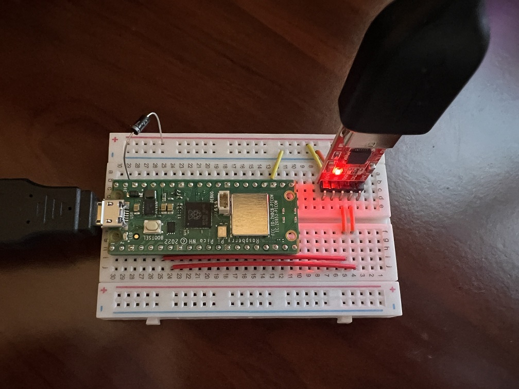 1. Pico W's USB port -> Switch 2. Pico W's pins 6/7/8/39 -> External UART 3. External UART -> Computer |