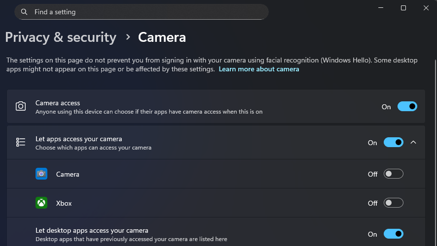 If so, the privacy settings for "Let apps access your camera" and "Let desktop apps access your camera" need to be enabled.